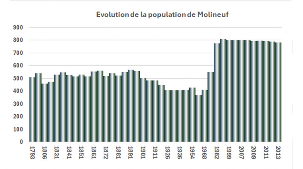 La population de Molineuf a peu évolué durant le XVIIIè et le XIXè siècle, pédiode au cours de laquelle elle s’est maintenue aux environs de 520 habitants à l’exception de la période post-révolutionnaire qui vit Molineuf perdre près de 15% de sa population en 5 ans.