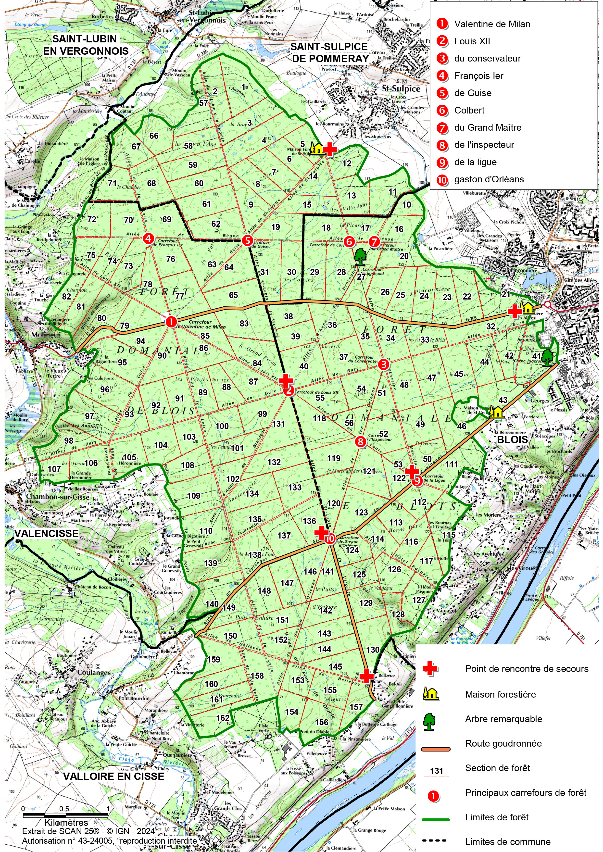 Gestion de la forêt.En 1291, Philippe Le bel crée l'administration des Eaux et Forêts, première structure de gestion du patrimoine forestier et ancêtre de l'Office Nationale des Forêts qui lui succède en 1966. Selon l'inventaire forestier de 2022, la France compte 17,1 millions d'hectares de forêt couvrant 30,8% du territoire. L'ONF gère aujourd'hui plus de 12 millions d'hectares de forêts et d'espaces naturels dont 4,6 millions d'hectares de forêts tempérées en métropole parmi lesquels on compte 1,7 millions d'hectares de forêts domaniales et 2,9 millions d'hectares de forêts de collectivités locales. La forêt domaniale représente un peu plus de 10% du total de la forêt française constituée pour l'essentiel de forêts et de bois privés (75%). Avec une superficie de 35 000 hectares, la forêt d'Orléans est la plus vaste forêt domaniale de France. Actuellement, la gestion de la forêt de Blois par l'ONF s'appuie du le plan d'aménagement forestier 2009-2028 ayant pour objectif la production de bois d'œuvre de chênes de haute qualité. Dans ce but, des coupes de regénération permettront la création de 360 ha de jeunes semis en remplacement des arbres âgés de plus de 2 siècles qui sont progressivement abattus et commercialisés auprès des exploitants forestiers. Sources : INVENTAIRE FORESTIER (ign.fr)