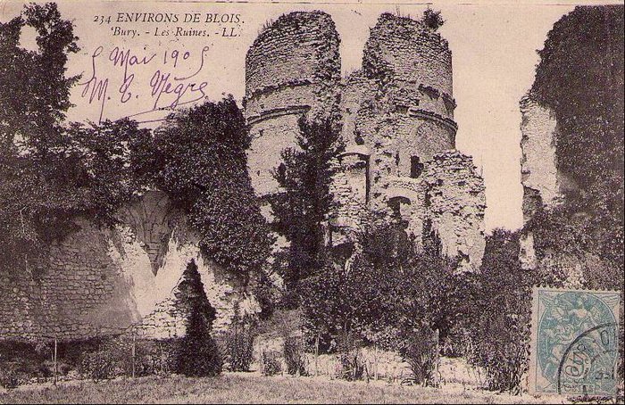 La guerre de Cent Ans devait causer la disparition du vieux château de Bury dont les Anglais s’étaient emparés et où il gardaient prisonnier Hugues d’Amboise, seigneur de Chaumont. Vers 1365 les troupes françaises, probablement emmenées par Louis II comte de Blois-Châtillon libèrent Bury. C’est peu après que l’on date sa destruction, vraisemblablement sur ordre de Charles V dans le but d’éliminer les forteresses féodales servant de refuge aux Anglais dont le passage en ces lieux est rappelé par la désignation d’un lieu-dit « ravin des Anglais ».