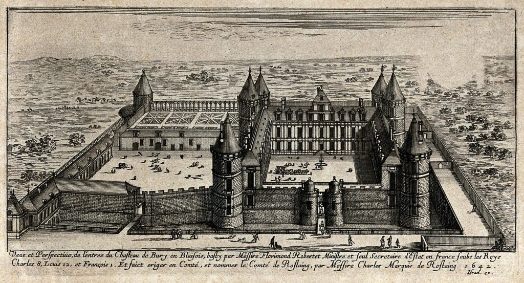 Le 2 janvier 1511, Florimond Ier Robertet(voir) successivement secrétaire de Charles VIII , de Louis XII et François 1er et trésorier de France, fit l’acquisition du domaine de Bury. Il y entreprit en 1511 la construction du premier château de la renaissance en France s’inspirant fortement de l’art italien. Un parc d’agrément avec jardin à la française parachevait l’œuvre. Le château fut achevé en 1524 deux ans seulement avant la mort de Florimond Robertet (1526). Il resta alors à sa veuve, Michèle Gaillard, qui y mourut en 1549. Son fils Claude et le fils de celui-ci, Florimond III, possédèrent à leur tour ce domaine. La baronnie de Bury fût propriété des Robertet jusqu’en 1604.