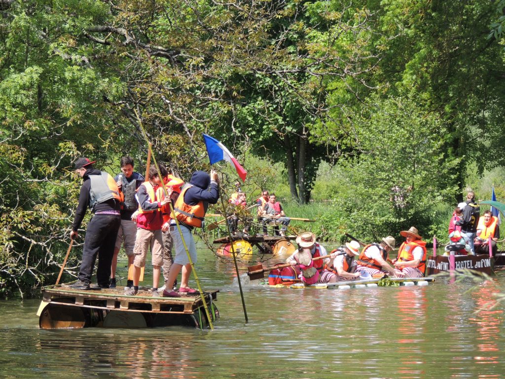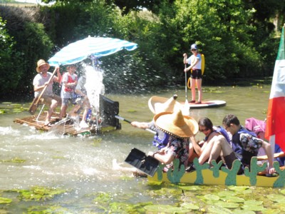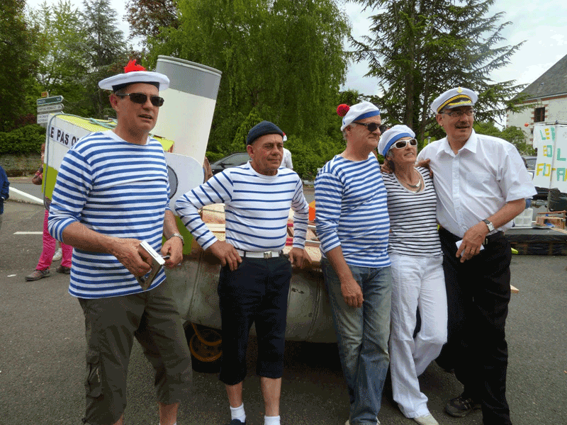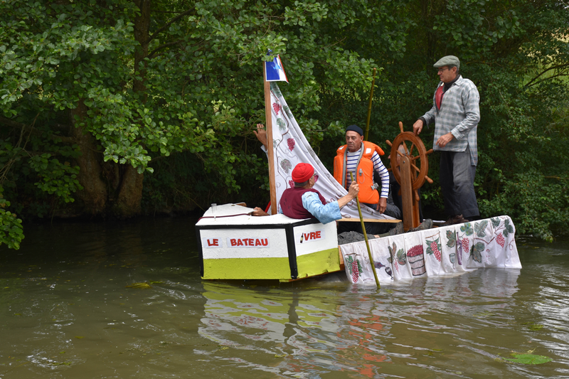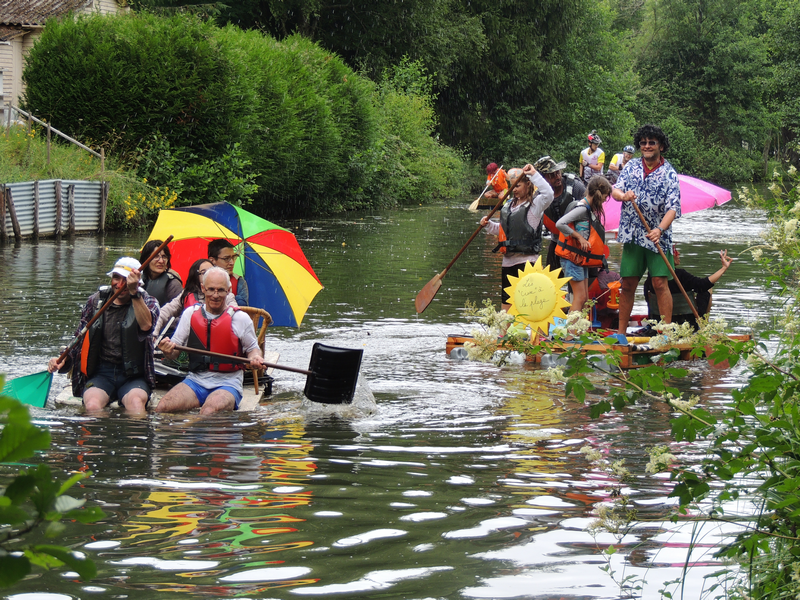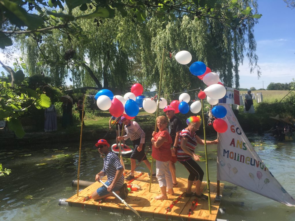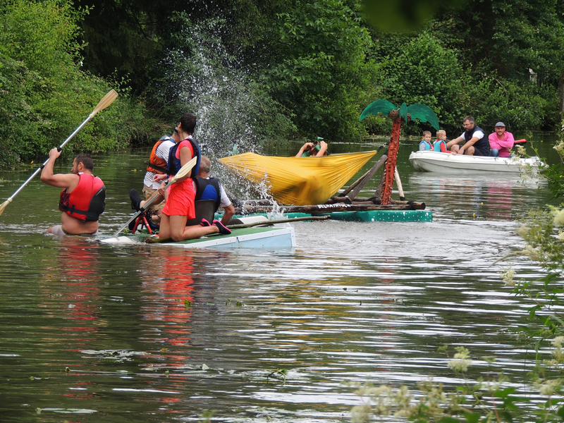 Après un apéritif offert par la Molineuvoise et un pique-nique champêtre auquel plus de 100 personnes prirent part, le défilé de radeaux pouvait s’élancer depuis le lavoir de Molineuf sous les encouragements amusés des nombreux spectateurs. Ils étaient 11 au départ, conduits par des matelots costumés à la navigation incertaine. Quelques enfants engoncés dans leur gilet de sauvetage, à la fois un peu inquiets et remplis de fierté, accompagnaient leurs parents pour une traversée magique. Tout au long du trajet, riverains (très nombreux cette année) et public mélangés encourageaient les marins d’eau douce, sans oublier de les arroser au passage, comme c’est désormais la tradition.