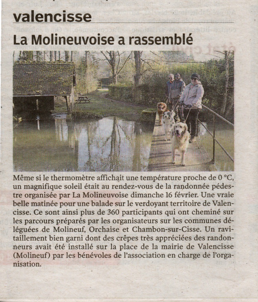 Pour La Molineuvoise, la randonnée de février revêt une importance toute particulière car, depuis des années, elle contribue très largement à son fonctionnement grâce à une très forte fréquentation. Alors que nous croyions cette randonnée bien installée au calendrier, nous avons dû nous confronter cette année avec la randonnée du RIT de Cellettes dont la date habituelle avait été modifiée. Cela nous a incités à compléter notre pause ravitallement en proposant aux randonneurs la dégustation de crêpes en espérant que cela suffise à limiter la perte de fréquentation. Nos bénévoles féminines, Babeth en tête, se sont donc mises à l’œuvre pour confectionner des centaines de crêpes. Et, sans doute grâce à elles, peut-être aussi au beau temps qui enfin s’était installé, cette randonnée a attiré 360 participants. C’est certes 100 à 150 de moins que les années précédentes, mais bien plus que nous le redoutions.