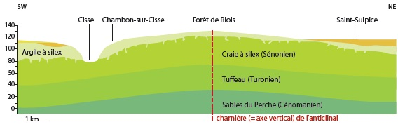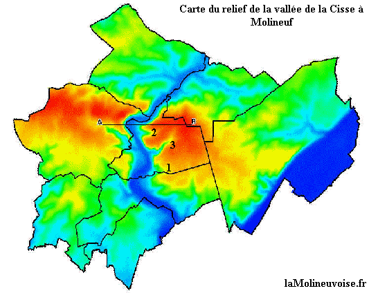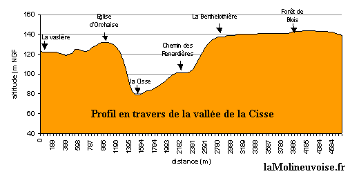 A cette époque, une mer épicontinentale recouvrait pratiquement tout le bassin parisien. Cette mer en se retirant déposa des débris carbonatés à l'origine de ces formations crayeuses que l'on nomme ici " craie de Blois " et dont on peut voir à Molineuf des affleurements dans les pieds de coteau en falaise souvent creusé de caves. Les phénomènes karstiques sont nombreux au sein de ces formations; la grotte d'Orchaise en est un exemple les plus significatifs. Les formations lacustres des calcaires de Beauce apparus au cours du tertiaire qui occupent la plus grande part du plateau beauceron n'influencent la morphologie de la vallée de la Cisse que sur son cours supérieur. La vallée de la Cisse est fréquemment entrecoupée de vallées secondaires correspondant à des vallées fossiles dépourvues de tout réseau hydrographique qui se sont formées au cours des périodes interglaciaires du quaternaire. A Molineuf, la vallée des Anglais (1), la Maltière (2) ou la vallée de la forêt de Blois (3) en sont des exemples caractéristiques. Le fond de vallée marécageux est recouvert de sols tourbeux très compressibles en épaisseur variable qui peut atteindre plusieurs mètres par endroit rendant le secteur peu favorable aux activités humaines. |