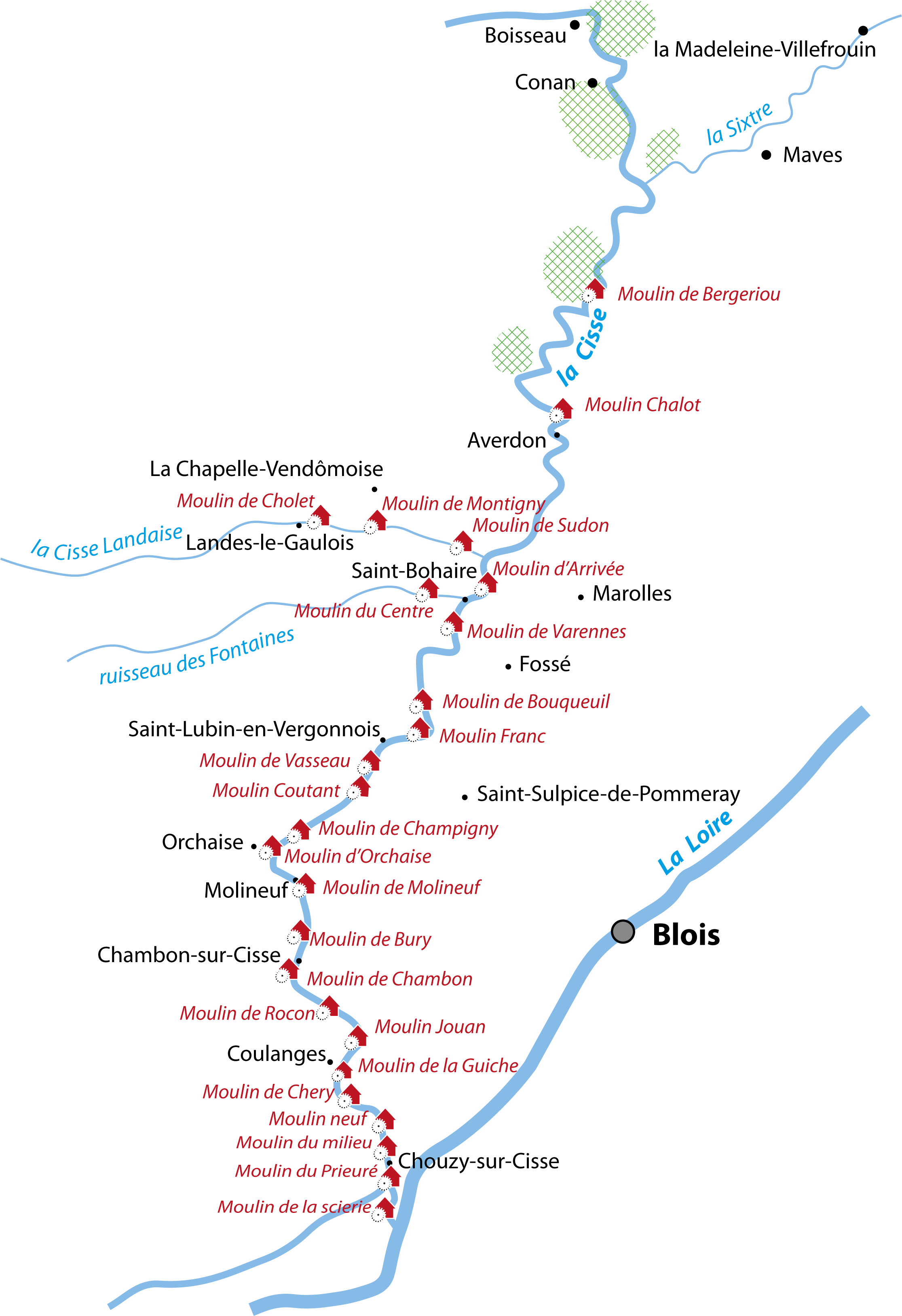 Cliquez pour consulter la liste des moulins sur la Cisse et ses affluents Cliquez pour consulter la page sur la grotte d'Orchaise