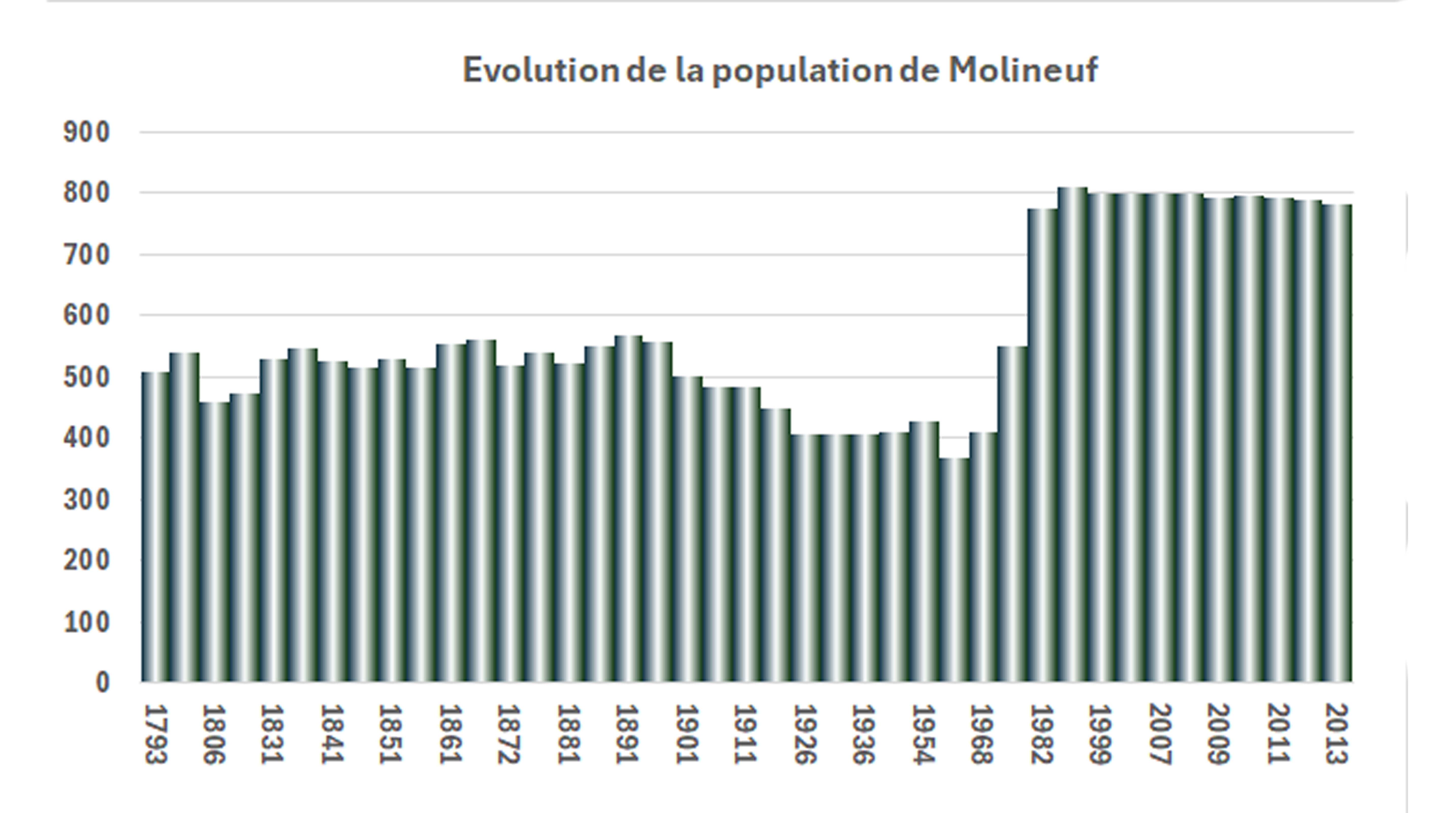 Evolution de la populationLa population de Molineuf a peu évolué durant le XVIIIè et le XIXè siècle, pédiode au cours de laquelle elle s’est maintenue aux environs de 5 20 habitants à l’exception de la période post-révolutionnaire qui vit Molineuf perdre près de 15% de sa population en 5 ans. Le début du XXè siècle coïncide avec le début du déclin démographique à Molineuf, phénomène qui sera amplifié, d’abord par la 1ère guerre mondiale, puis par le mouvement d’exode rural qui ne s’achèvera que vers la fin des années 1960. A cette époque, Molineuf ne comptait plus que 368 habitants. Durant les deux décennies de1960 à 1980, le mouvement de périurbanisation, qui vide les villes centre vers leurs périphéries, voit la population de Molineuf s’accroître fortement passant de 369 habitants à 776 habitants. Cette époque marque une évolution structurelle très forte pour Molineuf qui perd son caractère rural, où la viticulture tenait une place prépondérante, pour devenir une commune « dortoir » très dépendante de la ville centre. A partir des années 1980, la population de Molineuf ne progresse plus, elle enregistre même un léger tassement tendanciel correspondant, d’une part, au ralentissement très marqué du mouvement de périurbanisation, et d’autre part par la réduction très sensible des secteurs urbanisables sur la commune (on rappellera à cet égard que Molineuf est occupé pour 50% de son territoire par la forêt domaniale de Blois, que le fond de vallée, en partie inondable, est peu propice à la construction et que certains coteaux instables interdisent la construction d’habitations). En 2016 année de fusion des communes de Molineuf, Orchaise et Chambon, il y avait 799 habitants à Molineuf. Au dernier recensement de 2019, Molineuf comptait 805 habitants.