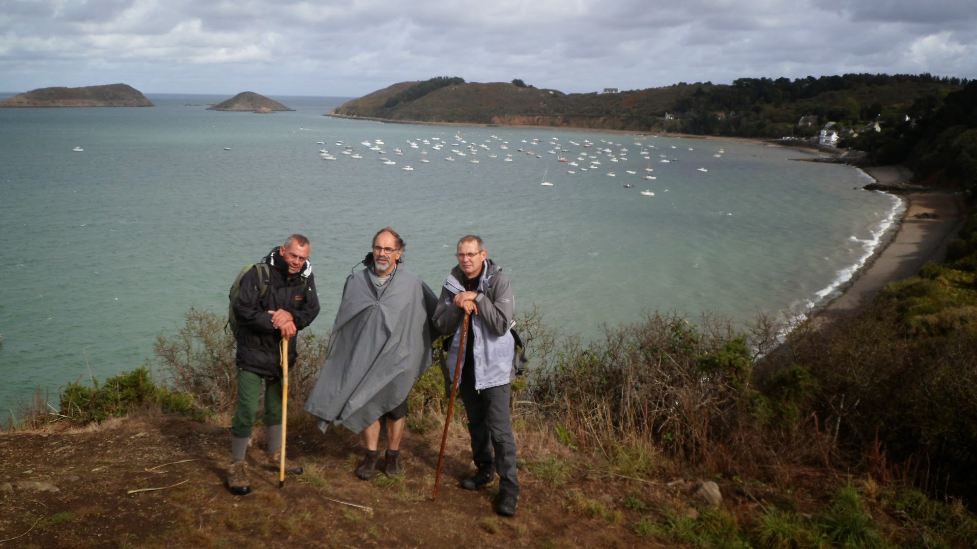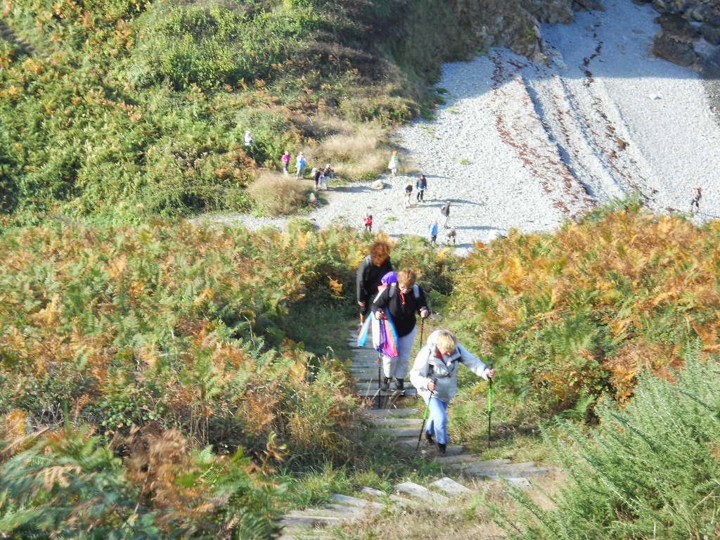 Description de la randonnéeNous avons débuté le parcours vers 11h30 le samedi 4 octobre 2014. Le temps était à la pluie et le moral de nos randonneurs un peu en berne sous les ponchos. Mais le temps est changeant en Bretagne. Et une heure plus tard, le soleil était de retour et ne devait plus nous quitter du week-end. Durant la quasi totalité de la randonnée nous avons suivi le GR.34 en partant de la pointe de Guilben à Paimpol dont nous n'avons parcouru que la partie sud. On longe ensuite le bord de mer jusqu'à l'abbaye de Beauport au kilomètre 5, puis on pénètre immédiatement après dans un bois où l'on rencontre les premièrs escaliers aux marches irrégulières. Il y en aura beaucoup d'autres tout au long du parcours. Au kilomètre 12, on rejoint la pointe de Plouézec en suivant le GR qui serpente dans une lande de fougères et de bruyères. Cette partie du parcours est assez exigeante car elle comporte de nombreuses petites côtes assez raides, souvent équipées de marches inégales. Encore 1,5 km et on aborde le ravin de Porz Donan qui descend jusqu'au niveau de la mer puis remonte en haut de la falaise par des escaliers de plus de 200 marches. Les 3 derniers kilomètres sont sans difficulté, le GR circulant sur le plateau souvent directement sur une chaussée goudronnée. Pour finir, le GR descend sur le petit parking de Porz Pin par un petit sentier en pente assez raide et tortueux. Nous rejoignons le car stationné au hameau du Questel vers 17h30. Au total, nous avons marché un peu moins de 5h pour parcourir 17.5km. Nous avons pris un peu de temps pour visiter au passage l'exposition permanente des sculptures de Kito sur la pointe de Bilfot, et un peu plus de temps encore pour la pause pique-nique. Téléchargez la trace de la randonnée au format kml