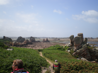Description de la randonnéeLe car nous a déposé, ce dimanche 5 octobre vers 10h30, dans l'anse de l'Enfer au sud-ouest du village de Plougrescant, commune la plus septentrionale de Bretagne. Nous nous trouvons là dans l'ancien pays du Trégor. Le temps était superbe avec un ciel bleu sans nuage, un tout petit vent et une température agréable de fin d'été. Le GR.34 pénètre dans un bois étroit de châtaigniers qui longe le littoral durant le premier kilomètre. Après avoir traversé la zone marécole de Lanagu au kilomètre 2, puis le joli petit port de Kéricu (km 4), on arrive, à travers la lande, à la partie la plus spectaculaire de la randonnée. Voici d'abord la pointe du Château, d'où l'on découvre au large l'archipel des 7 îles. Un peu plus loin, la célèbre maison de Castel Meur enchâssée entre 2 blocs de granite, puis le Gouffre, énorme amas rocheux attaqué par les vagues. On continue à travers la lande et en traversant quelques grèves de galets qui roulent sous les pieds. On passe devant l'île de Pors Scaff (km 9), puis on découvre l'anse de Gouermel qui se referme sur Buguéles, point final de la randonnée. Cette marche ne présente aucune difficulté mais un intérêt touristique évident. Il nous a fallu un peu moins de 4 heures pour faire le parcours, sans compter les pauses "touristiques"; pour le pique-nique et pour une baignade réservée aux plus hardis. Téléchargez la trace de la randonnée au format kml